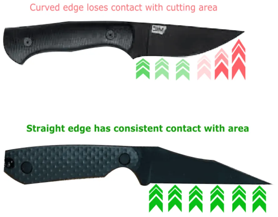The straight edge means that the force of a cut is spread evenly across the whole blade, down to its tip.