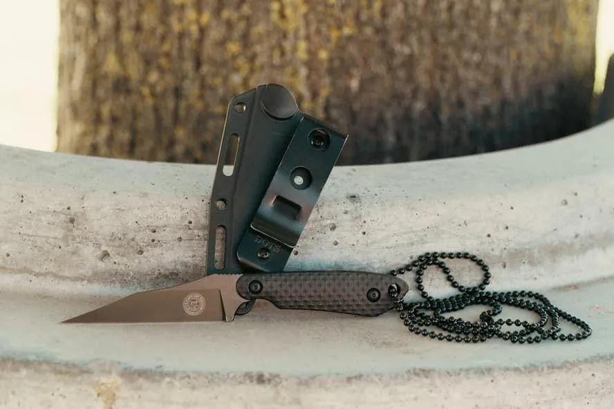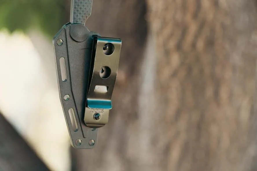 The sheath has a solid belt clip and several “spacers” that let you equip your knife in dozens of different setups based on:
